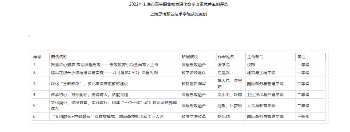 2022年上海市高等职业教育深化教学改革优秀案例评选上海思博职业技术学院获奖案例