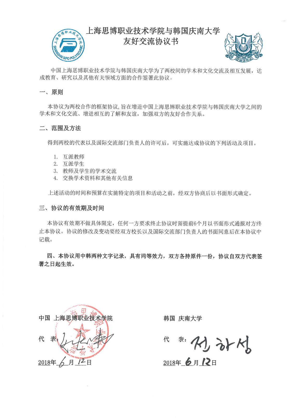 上海思博职业技术学院与韩国庆南大学友好协议书
