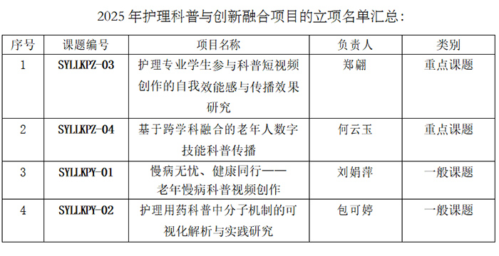 四位老师的课题聚焦护理科普前沿,分别从人才培养、老年服务、慢病管理、专业解析等维度切入,兼具实践价值与创新意义,充分展现了我校教师在护理科普与创新融合领域的研究功底与敏锐学术视野。后续,学校将严格落实项目管理责任,全力保障课题研究顺利推进,督促项目负责人按方案高质量完成研究任务。学校还将持续聚焦护理科普与创新融合领域,鼓励教师深耕科研、积极探索,不断产出更多优质科研成果,为推动护理学科发展、助力科普事业进步注入新动能。
