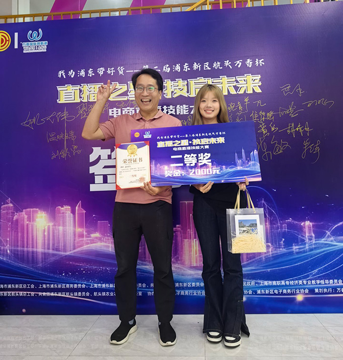 9月24日,第二届浦东新区"航头万香杯"直播之星・技启未来电商直播技能大赛决赛圆满落幕。我校商学院电子商务专业章力文、凡晓同学和关务-贯通专业张伊妮同学组成的"浦浦通"团队,经过三个月的激烈比拼,从全国300多支参赛队伍中脱颖而出,获得二等奖,商学院陈晓老师获评"优秀指导老师",学校荣获"优秀组织奖"。