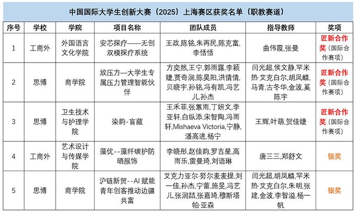 近日,上海市教育委员会公布了中国国际大学生创新大赛(2025)(上海赛区)获奖名单。上海工商外国语职业学院与上海思博职业技术学院学子在市赛职教赛道中携手发力,共斩获25个奖项。其中上海工商外国语职业学院收获“匠新合作奖”1项、银奖1项、铜奖6项,获奖名次和数量创历史新高;上海思博职业技术学院不仅斩获“匠新合作奖”2项、银奖1项、铜奖14项,同时学校还获得市赛“优秀组织奖”荣誉。