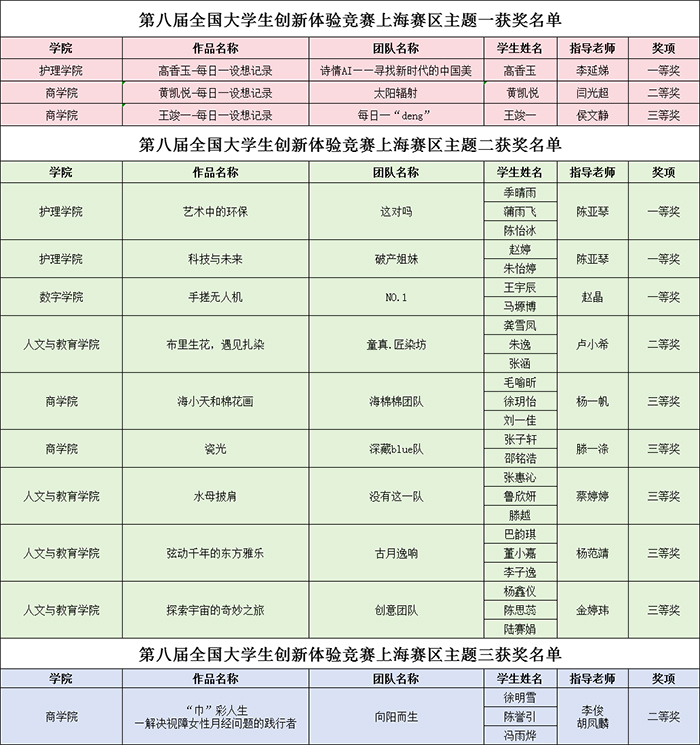 4月29日,第八届全国大学生创新体验竞赛(上海赛区)获奖名单揭晓,我校师生团队与全市32所高校,472组团队,1165名参赛选手同台竞技,在众多参赛队伍中脱颖而出,共获得一等奖4项、二等奖3项、三等奖6项,获奖数量和质量较去年均有提升。