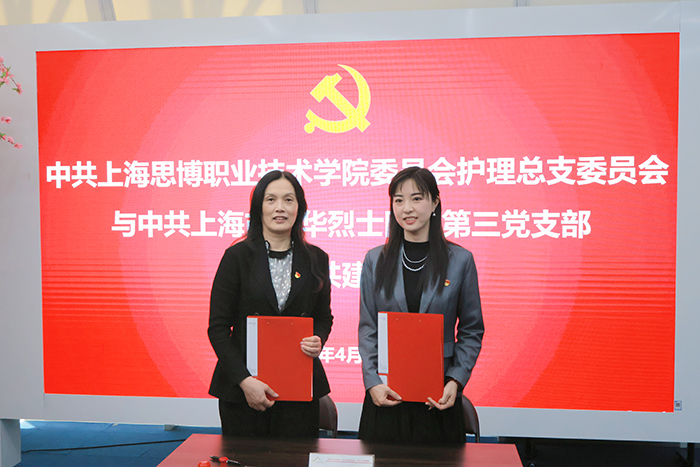 在热烈的掌声中,护理学院党总支书记叶萌与上海市龙华烈士陵园第三党支部书记丛雪娇正式签署党建合作协议。